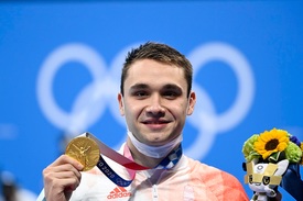 Az aranyérmes Milák Kristóf a férfi 200 méteres pillangóúszás eredményhirdetésén a világméretű koronavírus-járvány miatt 2021-re halasztott 2020-as tokiói nyári olimpián a Tokiói Vizesközpontban 2021. július 28-án. A magyar úszó új olimpiai csúccsal, 1:51.25 perccel nyert