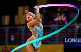Az orosz Alekszandra Szoldatova a szalaggyakorlatát mutatja be a szófiai ritmikus gimnasztika-világbajnokság egyéni versenyének összetett döntőjében 2018. szeptember 14-én. (MTI/EPA/Georgi Licovszki)