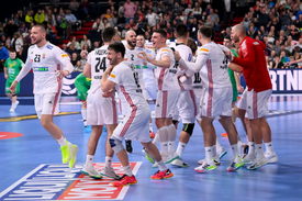 A magyar válogatott tagjai, miután 26-24-re nyertek Montenegró ellen a férfi kézilabda olimpiai kvalifikációs Európa-bajnokságon a müncheni Olympiahalléban 2024. január 12-én