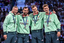 Gémesi Csanád, Szilágyi Áron, Szatmári András és Rabb Krisztián (b-j), az ezüstérmes magyar kardcsapat tagjai a dobogón a 2024-es párizsi nyári olimpia férfi kard csapatversenyének eredményhirdetésén a Grand Palais kiállítócsarnokban 2024. július 31-én