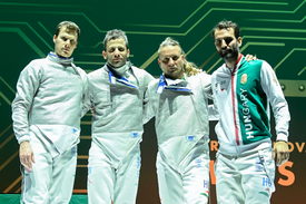 Szatmári András, Gémesi Csanád, Decsi Tamás és Szilágyi Áron (b-j) a Zarándi Csaba férfi kard csapat világkupaversenyen a budapesti BOK Csarnokban 2024. március 24-én.