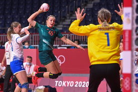 Háfra Noémi (k) és az orosz Antonyina Szkorobogatcsenko (b) és Anna Szedojkina (j) a világméretû koronavírus-járvány miatt 2021-re halasztott 2020-as tokiói nyári olimpia nõi kézilabda-bajnokságának B csoportjában játszott Magyarország – Orosz Olimpiai Csapat mérkõzésen a Jojogi Nemzeti Sportcsarnokban 2021. július 29-én.