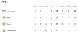 A csoportot a német csapat nyerte, így nyolcaddöntőbe jutott, mögötte a spanyol Real Betis másodikként szintén továbblépett, míg a harmadik skót Celtic Glasgow a Konferencia-ligába került át.