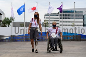 Hajmási Éva paralimpiai ezüstérmes (b) és Madarészné Mezõ Boglárka kerekesszékes (j) vívó az olimpiai faluban két nappal a tokiói paralimpiai játékok kezdete elõtt, 2021. augusztus 22-én.