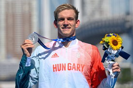 Tokió, 2021. augusztus 5. Az ezüstérmes Rasovszky Kristóf a férfi nyíltvízi úszók 10 kilométeres versenyének eredményhirdetésén a világméretû koronavírus-járvány miatt 2021-re halasztott 2020-as tokiói nyári olimpián az Odaiba Kikötõparkban 2021. augusztus 5-én.