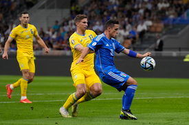 Az olasz Giacomo Raspadori (j) és az ukrán Denisz Mirosnicsenko a labdarúgó Európa-bajnoki selejtezõ C csoportjában játszott Olaszország – Ukrajna mérkõzésen Milánóban 2023. szeptember 12-én.