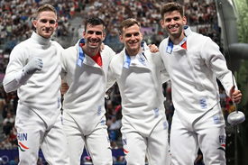 Andrásfi Tibor, Koch Máté, Nagy Dávid és Siklósi Gergely (b-j) a 2024-es párizsi nyári olimpia férfi párbajtőr csapatversenyének negyeddöntőjében a Grand Palais kiállítócsarnokban 2024. augusztus 2-án