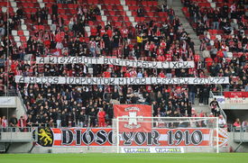 Diósgyőri szurkolók a Labdarúgó Fizz Liga 8. fordulójában játszott Diósgyőri VTK – Debreceni VSC mérkőzésen a diósgyőri DVTK Stadionban 2025. szeptember 27-én