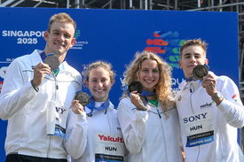 A Fábián Bettina, Mihályvári-Farkas Viktória, Rasovszky Kristóf, Betlehem Dávid összetételű magyar váltó bronzérmet nyert a nyíltvízi úszók vasárnapi csapatversenyében.