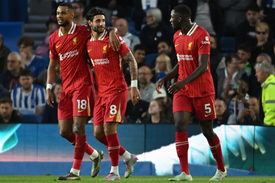 Szoboszlai Dominik, a Liverpool játékosa (k) csapattársaival, Cody Gakpóval (b) és Ibrahima Konatével ünnepli gólját az angol első osztályú labdarúgó-bajnokság 37. fordulójában játszott Brighton-Liverpool mérkőzésen Brightonban 2025. május 19-én