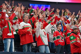 Magyar szurkolók a jégkorong-világbajnokság elsõ fordulójában játszott Dánia – Magyarország mérkõzésen a finnországi Tamperében 2023. május 13-án.
