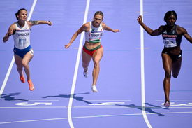 Takács Boglárka (k) a női 100 méteres síkfutás előfutamában a 2024-es párizsi nyári olimpián a párizsi Stade de France-ban 2024. augusztus 2-án