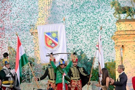 Nagy Arnold Rózsaszentmárton, Pogány, Füzér és Zirc lovasát utasította maga mögé a Millenniumi emlékmű körül kialakított különleges pályán.