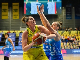A soproni Stefanie Dolson (b) és a szekszárdi csapatban játszó Zala Friskovec a női kosárlabda NBI döntőjének harmadik találkozóján játszott Sopron Basket – KSC Szekszárd mérkőzésen a soproni Novomatic Arénában 2022. április 23-án. MTI/Vasvári Tamás