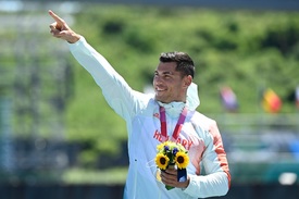 Az aranyérmes Tótka Sándor a férfi kajak egyesek 200 méteres versenyének eredményhirdetésen a világméretű koronavírus-járvány miatt 2021-re halasztott 2020-as tokiói nyári olimpián a Sea Forest Kajak-kenu Pályán 2021. augusztus 5-én