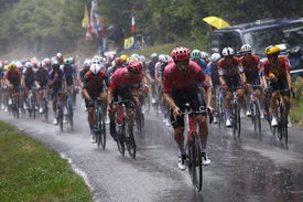 A mezõny a szakadó esõben a Tour de France francia országúti kerékpáros körverseny 20., Nantua és Pontarlier közötti, 184,2 kilométeres szakaszán 2025. július 26-án.