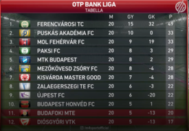 A címvédő Ferencváros előnye immár 16 pont a labdarúgó OTP Bank Liga tabellájának élén, miután vasárnap este hazai pályán 2-0-ra legyőzte a MOL Fehérvár FC-t. Az eddig második székesfehérváriakat megelőzte a Zalaegerszegen győztes Puskás Akadémia csapata. Pontszámban akkora a különbség a 2. helyen álló felcsútiak és az utolsó DVTK, mint a Fradi és a Puskás között.