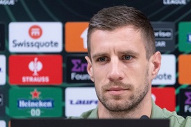 Varga Barnabás, a Ferencváros játékosa a csapat sajtótájékoztatóján a labdarúgó Konferencia-liga nyolcaddöntőjébe jutásért játszott, Ferencvárosi TC – Olimpiakosz visszavágó mérkőzés előtti napon a fővárosi Groupama Arénában 2024. február 21-én.