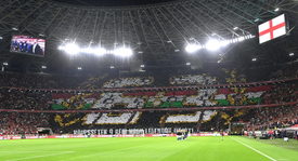 Az 1953. november 25-i angol-magyar mérkõzés végeredménye, 6:3 felirat egy élőképen a lelátón a labdarúgó világbajnoki selejtezõk 4. fordulójában játszott Magyarország – Anglia mérkõzés elõtt a Puskás Arénában 2021. szeptember 2-án