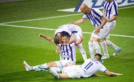 Az újpesti Simon Krisztiánnak második gólja után csapattársai gratulálnak a labdarúgó OTP Bank Liga 28. fordulójában játszott Újpest FC – Debreceni VSC mérkőzésen a budapesti Szusza Ferenc Stadionban 2020. június 9-én