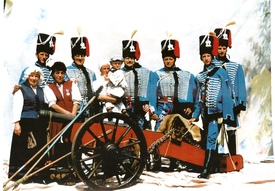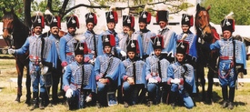 Mint egy festmény. Talán azért tűnik így, mert a huszárok kissé foltszerűek, a háttér meg mintha hiányozna. Fénykép pedig, és ez is valamikor az ezredforduló idején készült. Akik láthatók rajta: Rózsahegyi Zoltán, Vass Benő, Dariusz Wacławczyk, Varga László, Rózsahegyi Róbert és Kiss Jácint. A hölgyek nevét nem tudom, de az biztos, hogy ők a német hagyományőrzők, a kronachi helyőrség tagjai.