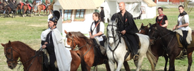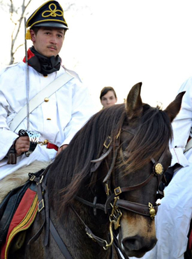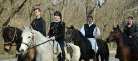 Péceliek az egykori péceli hadi események ösvényein: Marton Márk (fakón), Orosz Sára (szürkén), Hardi Miklós (zászlós), Pergel Dóra egy pejen