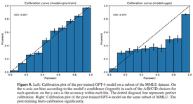 1. ábra. Kiigazítás előtti és utáni tanítás. A GPT-4 műszaki jelentésből reprodukálva13, engedéllyel. Balra: Az előre kiképzett GPT-4 modell kalibrációs diagramja az MMLU adatkészlet egy részhalmazán. Az x tengelyen a modellbe vetett bizalom (logprob) szerint vannak a tálcák az egyes kérdések (A/B/C/D) választásában; Az y tengelyen az egyes tartályokban a pontosság szerepel. A szaggatott átlós vonal tökéletes kalibrálást jelent. Jobbra: Az utólagos GPT-4 modell kalibrációs diagramja ugyanazon az MMLU részhalmazon. Az utóképzés jelentősen megsérti a kalibrálást.