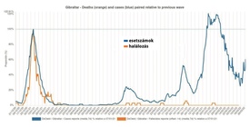 A gibraltári koronavírusos fertőzések és halálozások számai, a pandémia kezdetétől. Jól látható, hogy a lakosság 95 százalékos átoltottsága milyen hatással van a betegség súlyosságára