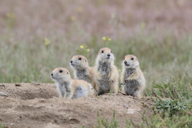 Feketefarkú prérikutya kölykök az üregük körül, a First Peoples Buffalo Jump Állami Parkban, Montanában, USA-ban. Fotó: ShutterStock/ Frank Fichtmueller