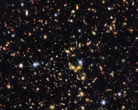 A felvételen több ezer galaxis látható, amelyek a kozmikus történelem különböző korszakaiból származnak. A közeli, kékes színű galaxisok fiatal, aktív csillagképző zónákat jeleznek, míg
