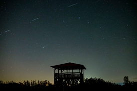 A C/2025 A6 (Lemmon) jelölésû üstökös (középen, balról), valamint mûholdak (fenn) a Mogyorósi-kilátó felett Salgótarján Rónafalu településrészérõl fotózva 2025. október 18-án este.