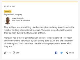 A BBC magyar-angol mérkőzésről szóló élő szöveges közvetítésében Alex Bysouth a himnusz kifütyülését követően megjegyezte, hogy Ez a himnusz aztán tényleg nem volt semmi, Wolverhampton igyekszik a legtöbbet kihozni abból, hogy válogatott meccsnek adhat otthont! A szurkolók pedig nem féltek hangokat adni a véleményüknek a magyar himnusz alatt.”