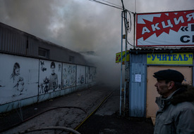 Játékbolt tüzét oltják tűzoltók, miután ukrán rakétatámadás érte az Oroszországhoz csatolt kelet-ukrajnai Donyeck belvárosát