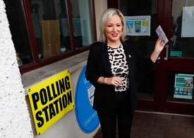 Michelle O'Neill, a Sinn Féin, a legnagyobb britellenes írországi katolikus párt észak-írországi tagozatának vezetője távozik egy szavazóhelyiségből, miután leadta voksát a parlamenti választáson az észak-írországi Clonoe-ban 2022. május 5-én