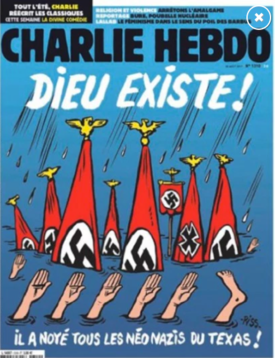 “Isten létezik! Vízbe fojtotta az összes texas-i neonácit!” – áll a szatírikusnak titulált francia magazin eheti címlapján.