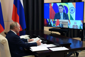 Vlagyimir Putyin orosz elnök videókonferencián keresztül vesz részt a Brazíliát, Oroszországot, Indiát, Kínát és Dél-Afrikát tömörítő BRICS-csoport csúcstalálkozóján a Moszkva melletti Novo-Ogarjovóban lévő elnöki rezidencián 2020. november 17-én