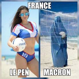 A Hillary for Prison (Börtönbe Hillaryvel!) nevű oldal az alábbi montázzsal kívánta illusztrálni a Le Pen-i és Macron-i Franciaország közti különbséget: