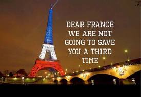 Az egyszerűen V4-nek keresztelt, a visegrádi országok híreit összegyűjtő oldal pedig ezzel a képpel kedveskedett francia barátainknak. Az angol nyelvű szöveg jelentése: „Kedves Franciaország! Harmadszorra már nem fogunk megmenteni benneteket”.