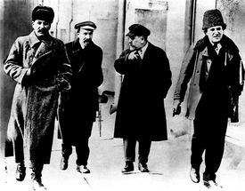 Mihail Pavlovics Tomszkij fehér holló volt a mozgalom vezetői között, ugyanis gyári munkásként kezdte pályafutását. Forradalmi tevékenysége is úgy indult, hogy munkahelyén szakszervezetet próbált összehozni, amiért kirúgták. Ezután belépett az Oroszországi Szociáldemokrata Munkáspártba, azon belül is a bolsevik szárnyat erősítette. Az emigrációs élet sem volt ínyére, noha számos letartóztatása közül az egyik alkalommal Franciaországba toloncolták, amint alkalma nyílt rá, hazaszökött. A hatóságok tanultak az esetből, és legközelebb öt év kényszermunkára ítélték. Végül az ideiglenes kormány szabadon engedte, így részt vehetett az októberi forradalomban. Mihail Kalinyin sem született polgári családba, eredeti szakmáját tekintve lakatos volt. A forradalom előtt a bolsevik Központi Bizottság póttagságáig jutott, utána viszont a legmagasabb szintig ívelt a karrierje. A legjelentősebb kakukktojás azonban kétségkívül Sztálin volt, azaz Joszif Visszarionovics Dzsugasvili. A későbbi diktátor a cári Oroszország grúziai tartományában született, és már viszonylag fiatalon, tizenegy éves korában megismerkedhetett a gyári munkával, ugyanis apja egy cipőgyárba küldte dolgozni. Anyja unszolására azonban hamarosan visszaülhetett az iskolapadba, később pedig papneveldébe került. Ám miközben a tbiliszi ortodox papi szemináriumban tanulta a teológiát, megismerkedett különböző orosz forradalmi marxista csoportokkal, eszméiket pedig annyira vonzónak találta, hogy hamarosan marxista diákkört vezetett a szemináriumban. Emiatt – nem meglepő módon – kicsapták a papneveldéből, így teljes idejét a mozgalmi munkának szentelhette. A Bolsevik Párt Központi Bizottságának tagjaként a forradalom levezénylésében is részt vehetett, sőt később teljhatalmú vezetőként igyekezett is megteremteni annak a legendáriumát, hogy gyakorlatilag Lenin harcostársaként vezette a forradalmárokat, ugyanakkor ma már tudjuk, hogy ez jórészt utólagos történelemhamisítás. Egyes, kordokumentumnak számító festményeken például nem is szerepel az 1917-es gyűléseken a bolsevikok vezetők között, de a történészek rámutatnak, hogy akad olyan kép is, például K. Juon alkotása, a Lenin felszólalása a Petroszovjet 1917. október 25-i ülésén, amely két változatban is elkészült. Az egyik 1927-ben, ezen az elnökségben Lenin mellett többek között Trockij, Lev Kamenyev és Alekszej Rikov kapott helyet. A második, 1936-os festményen viszont Lenin mellett Sztálin és két legközelebbi harcostársa, Vjacseszlav Molotov és Mojszej Urickij került Trockijék helyére.