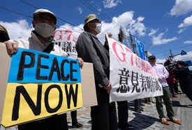 Tüntetők tiltakoznak a hét legfejlettebb ipari ország (G7) külügyminiszteri tanácskozásának kezdete előtt a Tokiótól északra fekvő Karuizavában 2023. április 16-án.