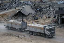 Palesztinoknak szánt humanitárius segélyszállítmánnyal megrakott teherautók megsemmisült épületek romjai mellett haladnak el, miután átlépték a Gázai övezet és Egyiptom közötti rafahi ellenőrzőpontot