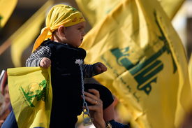 Gyermekét tartja kezében a Hezbollah radikális libanoni síita szervezet egyik támogatója egy kampányeseményen Bejrút közelében 2022. május 10-én, öt nappal a parlamenti választások elõtt.