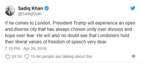 „Ha Trump elnök Londonba jön, egy nyitott és sokszínű várost fog látni, amely mindig az egységet választotta a megosztottság helyett és a reményt a félelem helyett. Kétségtelenül azt is látni fogja, hogy a londoniak ragaszkodni fognak a szólásszabadságot és a liberális értékeket.