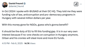 A napokban Donald Trump felfüggesztette a demokráciaexportőr USAID nevű szervezet működését. A Mandiner közölte Daniel Freund német EP-képviselő kiírását az X-ről, amelyben a politikus lényegében elismerte, hogy 2024-ben felvette a kapcsolatot az amerikai kormányzati szervezettel annak washingtoni főhadiszállásán.