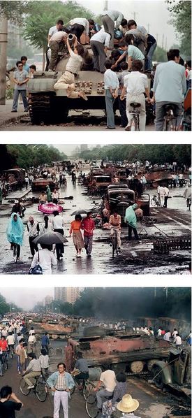 Látnunk kell az Amerika Hangja rádió által hergelt erőszakos tüntetők által agyonvert, elevenen elégetett katonák holttesteit is.Belénk égett a kép, amint egy fehér inges fiú széttárt karral áll a tank előtt. Magunkban már látjuk a következő pillanatot, amikor a védtelen emberi testet nemsokára maga alá tiporja a diktatúra csikorgó páncélos-lánctalpas járműve. Hatásos, megrendítő jelenet. Ám látnunk kell az Amerika Hangja rádió által hergelt erőszakos tüntetők által agyonvert, elevenen elégetett katonák holttesteit is, és tudnunk kell, hogy a Soros-hálózatot nem sokkal korábban Kínából is kitiltották.