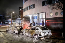 Kiégett rendõrautók a helyszínen, egy hágai konferenciaközpont elõtt 2024. február 17-én, miután két eritreai csoport összecsapott és randalírozott a holland fõvárosban.