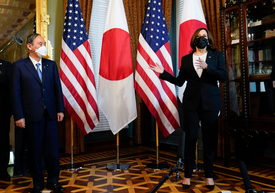 Kamala Harris amerikai alelnök (j) fogadja Szuga Josihide japán miniszterelnököt a washingtoni Eisenhower kormányzati irodaházban 2021. április 16-án.