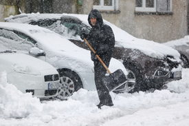 Havat lapátol egy férfi a Bosznia északnyugati részében fekvõ Bihács város egyik utcáján 2024. december 23-án.