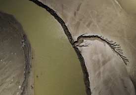 Drónfelvétel egy elapadt torkolatszerû öbölrõl a Yesa víztározó peremén, a navarrai Yesa város közelében 2022. augusztus 23-án. A Pireneusokban 2100 hektáron elterülő víztározó az átlagos vízmennyiségének egyharmadát elvesztette a tartós szárazság miatt