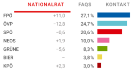 Az alábbi táblázat a szeptember 22-i, legutóbbi felmérés szerint várható eredményt mutatja, összevetve a legutóbbi, 2019-essel. A küszöb Ausztriában 4 százalék, így a Sörpártnak van, a Kommunista pártnak nincs esélye bejutni az osztrák parlamentbe.